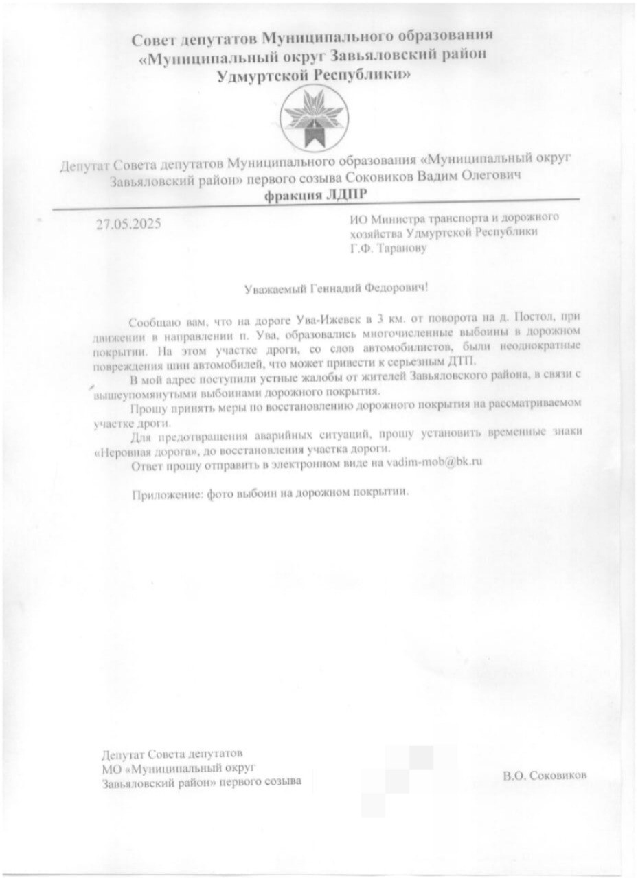 Депутат ЛДПР Завьяловского района Вадим Соковиков направил запрос в Министерство транспорта Удмуртской Республики в ходе проверки жалоб жителей района, которые были оставлены в социальных сетях